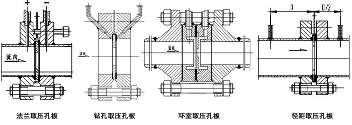 屬標(biāo)準(zhǔn)孔板。取壓方式為管道取壓。上游取壓孔中心位于孔板前面一倍管道內(nèi)徑處。下游取壓孔中心位于距離孔板后端面為管內(nèi)徑之半的地方。