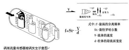 一定雷諾數(shù)范圍內(nèi)(2×104~7×106 ),旋渦的釋放頻率f與流體流速V及旋渦發(fā)生體的迎流面寬度d之間關(guān)系式為f=St•v/d,式中St為斯特勞哈數(shù),它是一個無量綱的系數(shù),只要準確測出頻率f,就可以求得流體流速v,由v求出體積流量。
