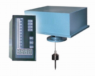 探測速度:0.15m/s 測 量 帶:不銹鋼鋼絲繩 重錘重量:1kg 電機停轉(zhuǎn)力矩:5N.m 功 耗:靜止時 0W 運行時 40W 環(huán)境溫度:-40℃~+60℃ 重 量:30kg 電源電壓:220VAC±10% 50Hz±1Hz 功 耗:靜止時 15W 運動時 55W 環(huán)境溫度:30℃~+60℃ 數(shù)字顯示:0.00~20.50(米) 電流輸出:4~20mA 精 度:±1% 定時時間:15~130分鐘(或按用戶要求定) 與傳感器大距離:0.5km 重 量:5kg 外形尺寸:寬88×高159×長503 開孔尺寸:寬(77+1)×高(153+1) ■ 三.產(chǎn)品工作原理 重錘料位計安裝在料倉頂部的料位計傳感器的探測過程由控制顯示儀表發(fā)出的信號控制。傳感器由可逆電機、蝸輪、蝸桿、絲杠、齒輪軸、繞線筒、靈敏杠桿等組成。當傳感器接到探測命令時:電機正轉(zhuǎn),經(jīng)蝸輪、蝸桿減速后帶動齒輪軸和繞線筒轉(zhuǎn)動,使鋼絲繩下放,帶動重錘由倉頂下降。當重錘降至料面時被料面托起而失重,鋼絲繩馳,靈敏杠桿動作使微動開關(guān)接觸,控制顯示器獲得該信號立即發(fā)出電機反轉(zhuǎn)命令,重錘上升返回,直到繞線筒碰上到頂開關(guān),電機停轉(zhuǎn),重錘回到倉頂原始位置,完成一次探測過程。在此過程中控制顯示儀表通過檢測繞線筒的轉(zhuǎn)數(shù)計算出重錘從倉底到料面間的距離,在面板進行數(shù)字顯示,并在后面板端子上輸出4~20mA電流。