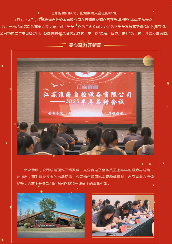 江蘇淮海自控設(shè)備有限公司2025年半年總結(jié)會議順利召開!7月12-13日,江蘇淮海自控設(shè)備有限公司在君瀾溫泉酒店召開為期2天的半年工作會議。這是一次承前啟后的重要會議,既是對上半年工作的全面檢閱,更是為下半年發(fā)展蓄勢賦能的關(guān)鍵節(jié)點(diǎn)。公司管理層與來自各部門、各崗位的40余名代表齊聚一堂,以"總結(jié)、反思、提升"為主題,共繪發(fā)展藍(lán)圖。